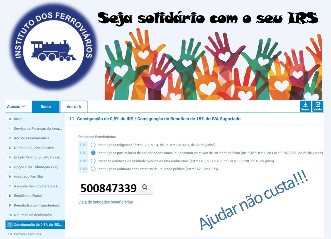 O Instituto dos Ferroviários precisa de si! Para que possamos continuar a acolher crianças e jovens em perigo, pedimos-lhe que nos apoie através do seu IRS, colocando o NIF 500 847 339 do Instituto dos Ferroviários no quadro 11, seleccionando Instituições Particulares de Solidariedade Social ou pessoas colectivas de utilidade pública, do modelo 3 (rosto), da declaração de IRS.
